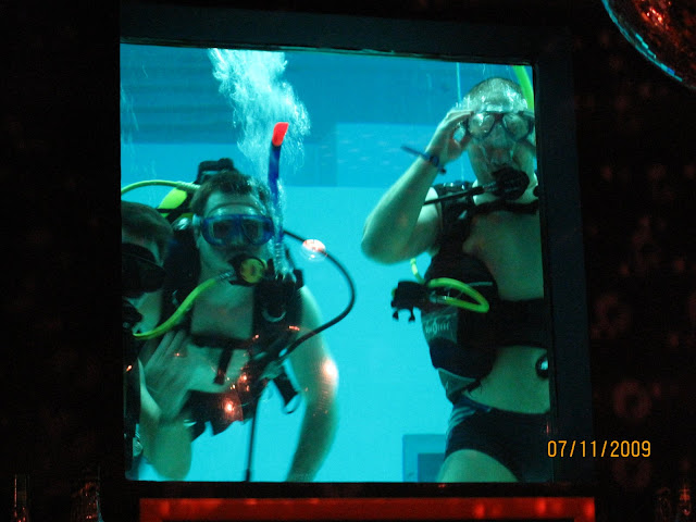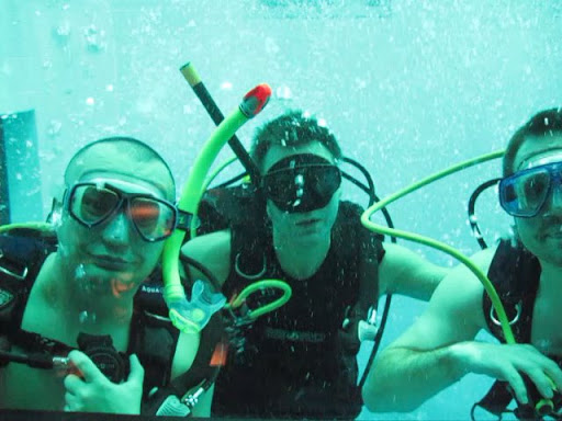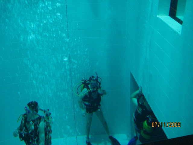 Po wyjściu z basenu należy dobrać kamizelkę (rozmiary od XS do XXXL), pobrać pełną butlę oraz automat i poskładać sprzęt a po złożeniu sprawdzić. Uwaga, zakładanie sprzętu dozwolone jest wyłącznie w wodzie, na schodkach lub w części o głębokości 1,5 metra. Gdy sprzęt jest założony, sprawdzenie partnerskie wykonane można zanurzyć się i kierować w głębiny. Zasadniczo trasy są dwie: albo bezpośrednio do studni, albo przez część 10 i tunel. Amatorzy pobytu na głębokości znikają zwykle natychmiast w studni a zwiedzający, cieszący się z nurkowania i szlifujący umiejętności płyną w większości spokojnie na 5 metrów, machają przez okienka, spływają na 7 (machając radośnie płetwami przez kolejne okienka) i dalej spokojnie osiadają na 10 m trenując trym i pływalność… Walenie z całej siły kolanami lub butlami w kafelki jest dość niemile widziane przez obsługę ze względu na możliwość zanieczyszczenia basenu krwią lub połamanie kafelków. Swoja drogą woda jest przedziwna – cieplejsza niż w Morzu Czerwonym, bo 33st.C ma zwykle a do tego jako słodka (a właściwie kwaśna od chloru lub ozonu) wypiera słabiej, po krótkiej chwili można się jednak przyzwyczaić do warunków będących skrzyżowaniem Egiptu z Mazurami.